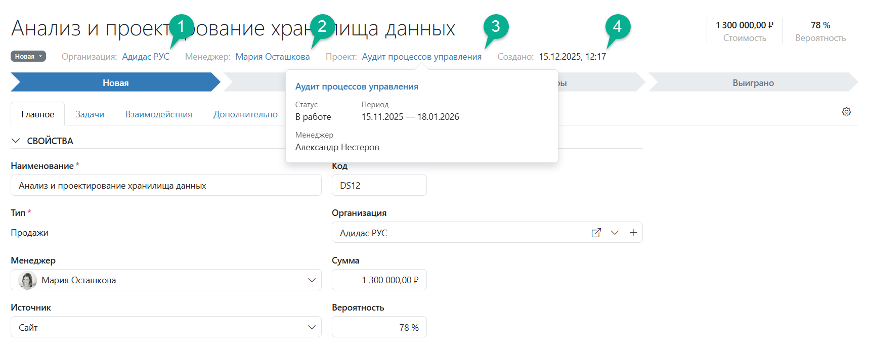 popup — используется для навигационных свойств. При клике откроется всплывающее окно с данными связанной сущности, из которого можно перейти в её карточку.link — используется для навигационных свойств. Отображается как обычная ссылка.text — можно использовать для любых свойств. Отображается как обычный текст.Исходя из примера конфигурации выше, в заголовке карточки будут показаны четыре свойства: