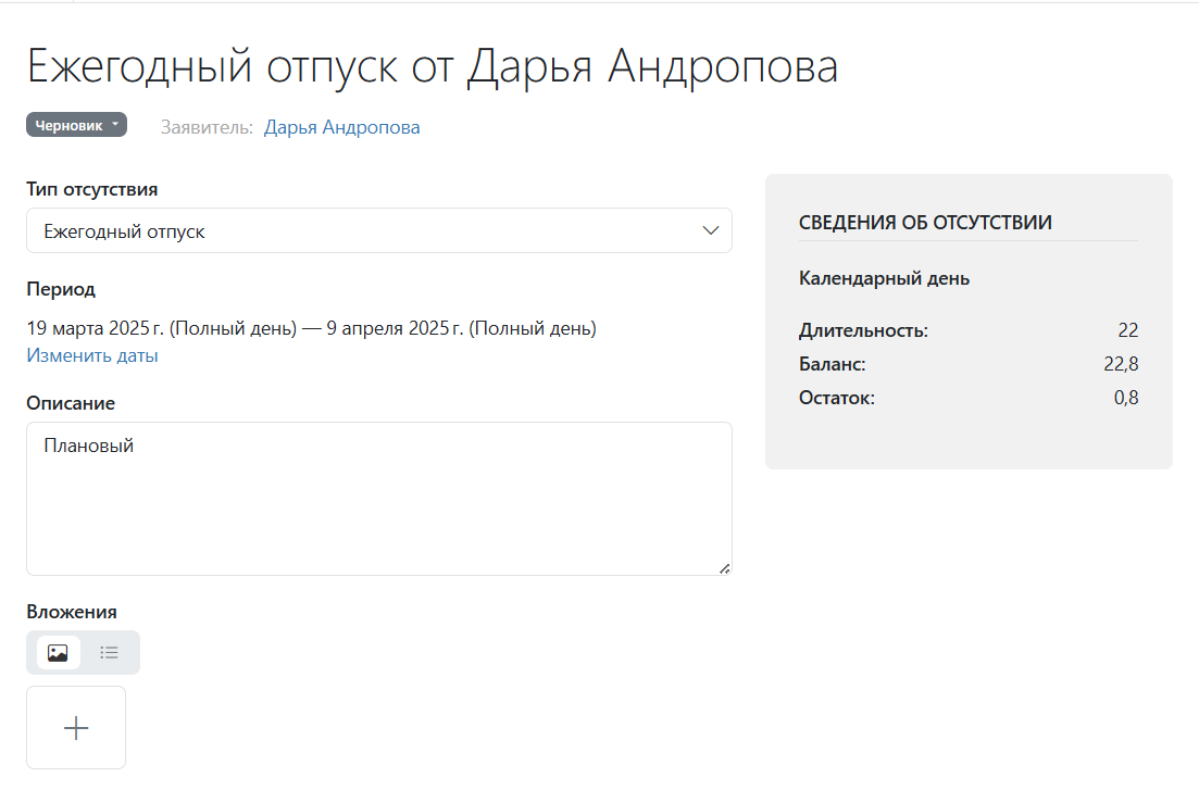 Вложение — позволяет прикрепить к заявке файл (например, заявление на отпуск или скан больничного листа).
